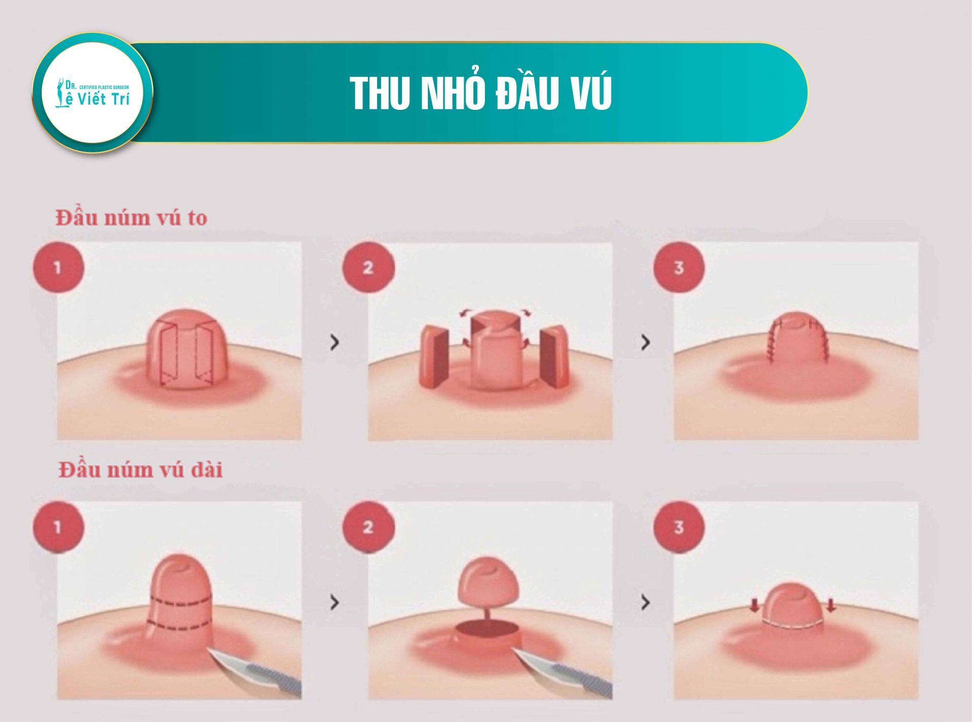 Bác sĩ tuỳ vào tình trạng núm vú phì đại theo chiều ngang hay chiều dài mà thực hiện phương thức phẫu thuật phù hợp theo tỉ lệ đo vẽ đã thực hiện ở bước thăm khám. Vết cắt được khâu bằng chỉ thẩm mỹ để mau lành và giảm khả năng để lại sẹo xấu sau phẫu thuật.